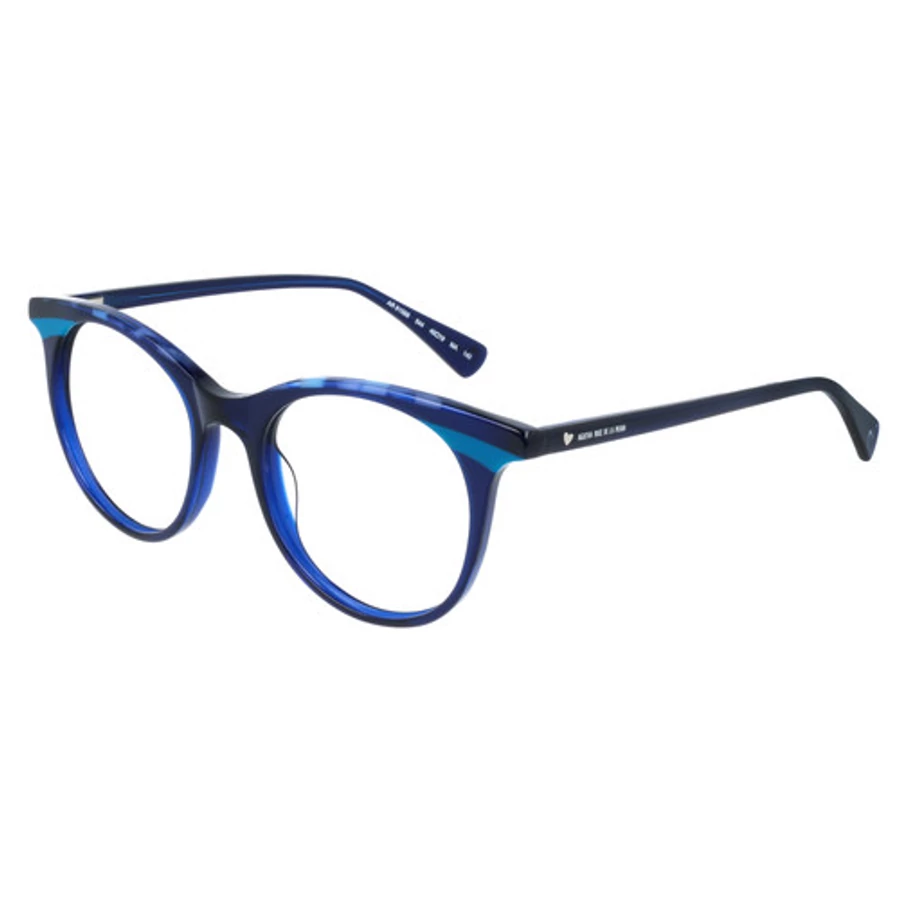 Ez a keret kék színben sziporkázik. A frontban keverednek a kék szín árnyalatai, amely egyfajta játékosságot ad a szemüvegnek. A kerek forma egyedi, páratlan megjelenést kölcsönöz viselőjének.