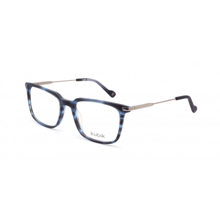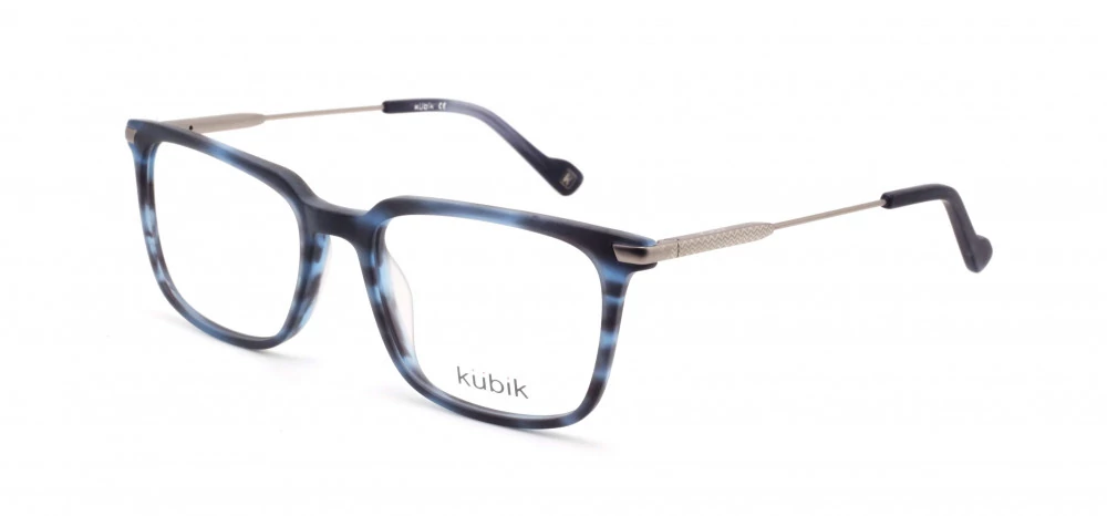 Kübik Cos kollekció egyik férfi modellje. Klasszikus formájú, férfias, sötét és világoskék mintás, acetát front és diszkrét ezüst színű nikkel szár teszi ellenállhatatlanná viselőjét. Kiemeli az elegáns, sármos megjelenést, bármely alkalomra pompás választás.