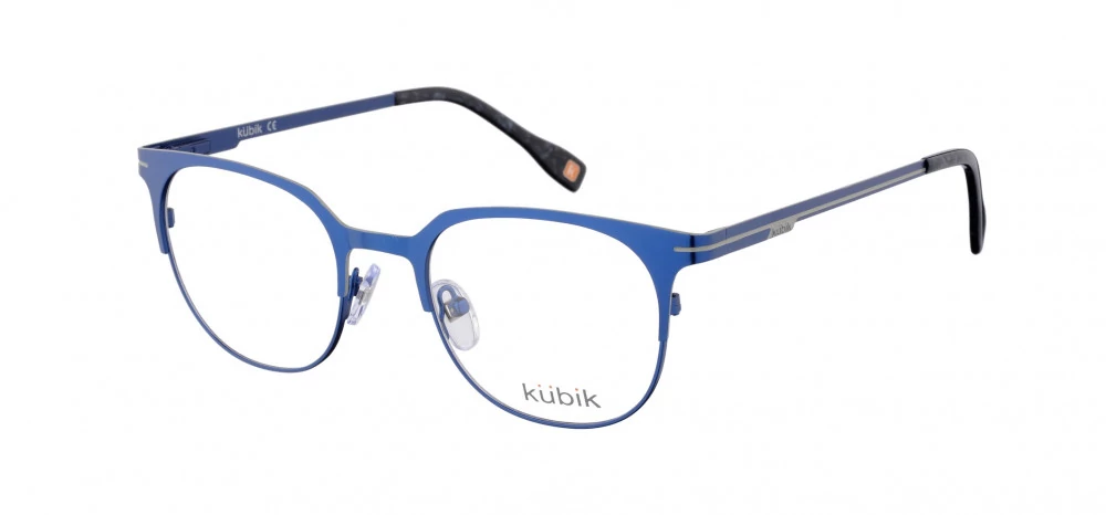 Kübik Urban kollekció tagja, fémből készült férfi keret. Anyagának köszönhetően könnyű, a szilikon orrtámasz pedig kényelmes illeszkedést biztosít. A kék frontot szépen kiegészíti a szintén kék száron végighúzódó ezüst csík és a márványmintás szárvég. A fiatalos, laza, egyszerű stílust kedvelőknek ajánljuk.