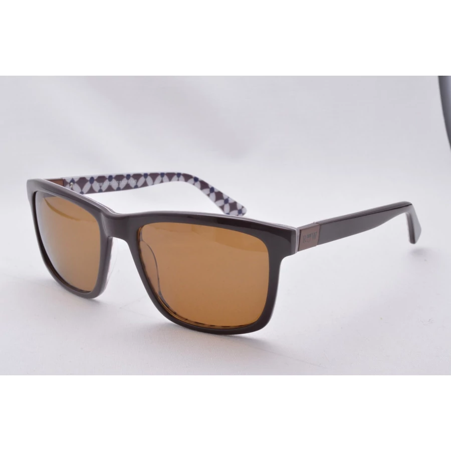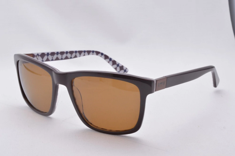 Női napszemüveg az egyszerűbb színek kedvelőinek. A modell egy szögletes formájú barna színű szemüveg. Szárai barna színűek, amely fehér virág mintával lett ellátva. Műanyag barna lencséi vannak.